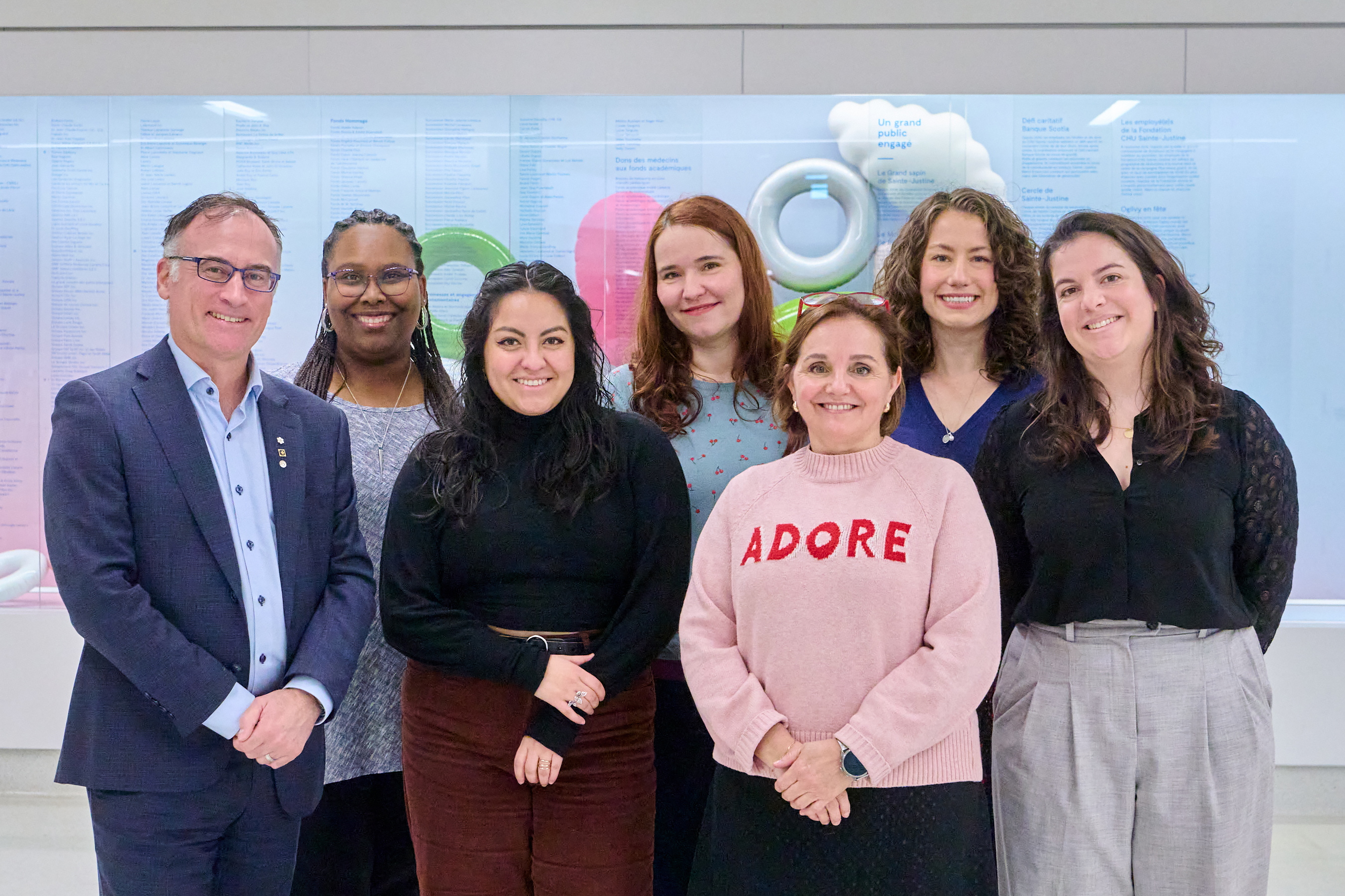 Photo : Carl-Éric Aubin, Rachël Saint Paul, Melany Juarez, Julia Rouchet, Anne-Marie Alarco, Camille Lachance Gaboury et Roxanne Perrin © CHU Sainte-Justine (Véronique Lavoie)